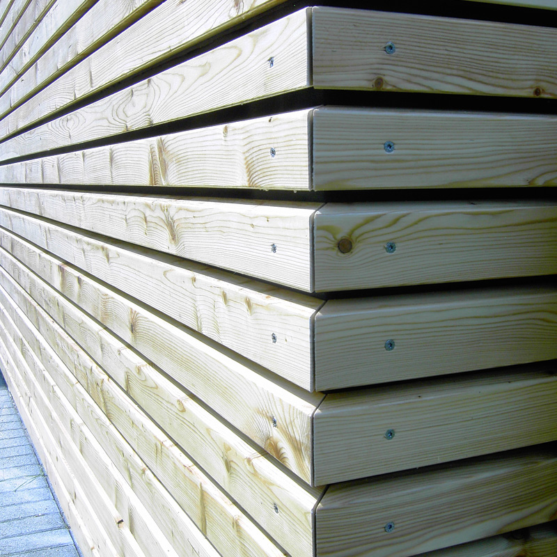 Als Außenverkleidung oder besser Außenschalung wurden massive Lärchenlamellen gewählt, die dunklen Zwischenfugen wurden durch das Montieren der Lamellen auf einer vorher angebrachten Dachunterspannbahn erreicht.